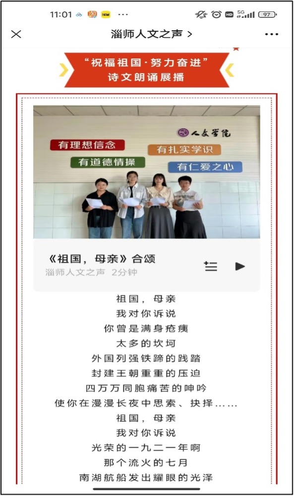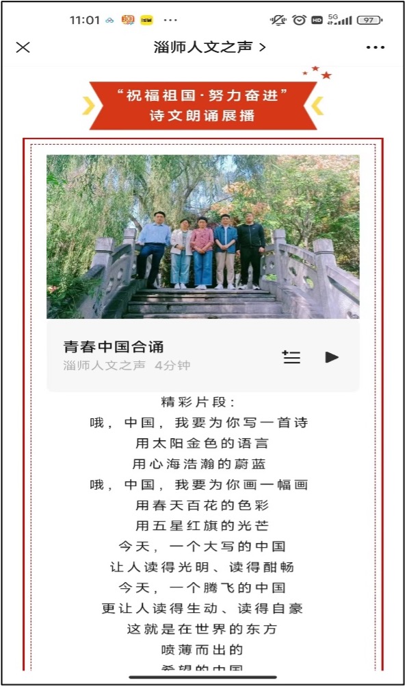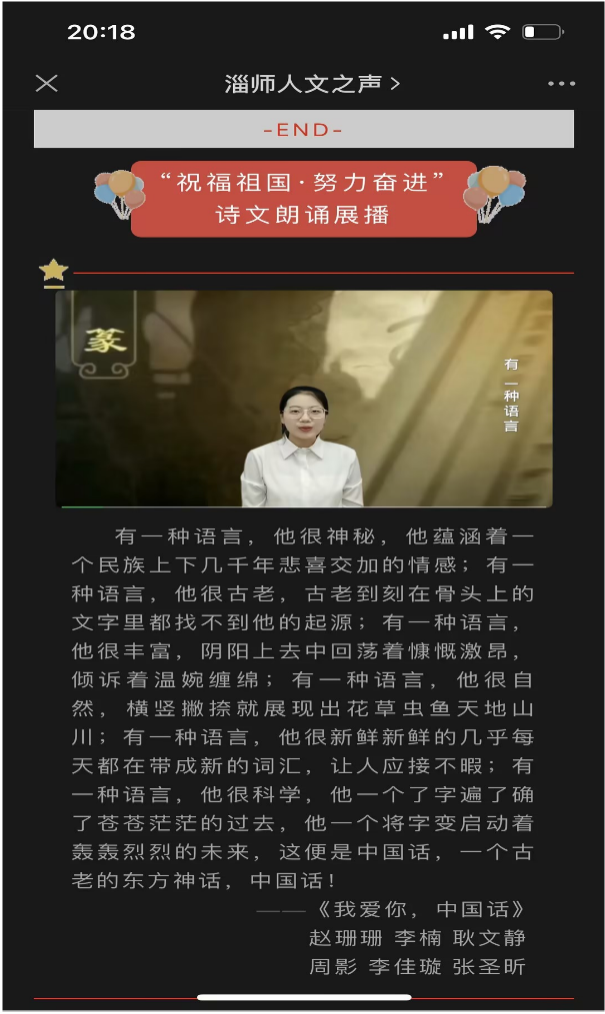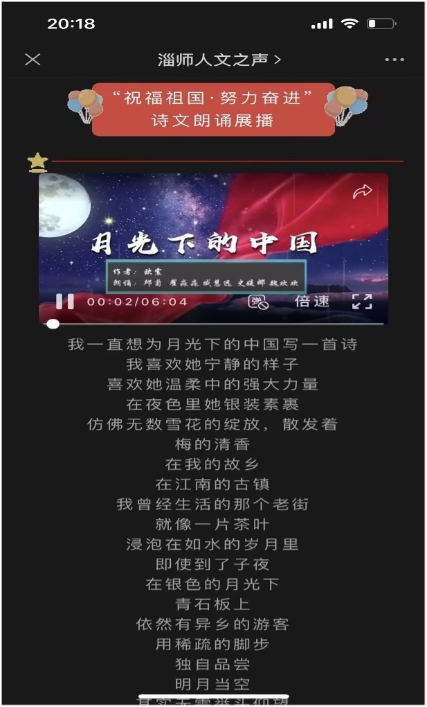 《祖国啊,我亲爱的祖国》《月光下的中国》《我爱你,中国话》《我骄傲,我是中国人》《诗意中国》《青春中国》《我的祖国》《祖国,母亲》等优秀的诗文篇章,在老师们的朗诵中产生了强大的精神力量,传达出爱党爱国、自强不息、文化自信等理想信念。伴随着线上展出,这些优美诗篇引领公司全体师生再次追忆七十余年的峥嵘岁月和伟大功绩,共同为祖国母亲庆生,立志奋进,为祖国、为淄师的美好未来再筑新篇。
