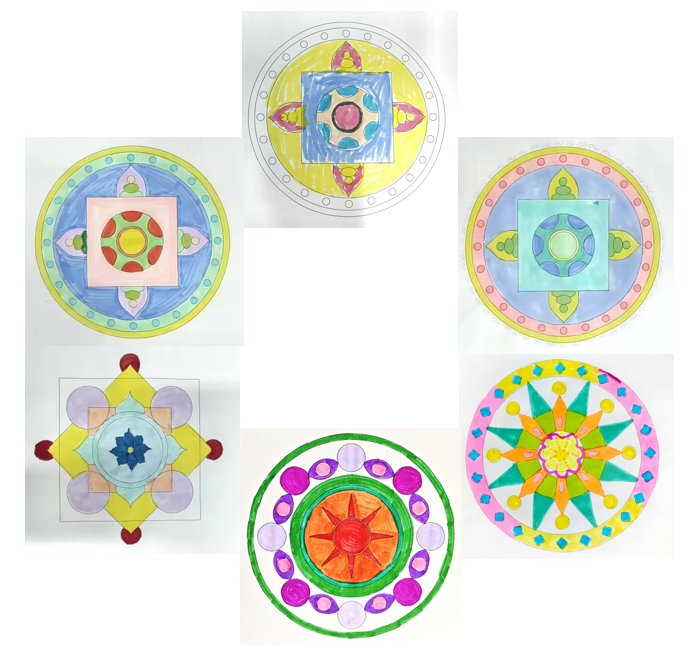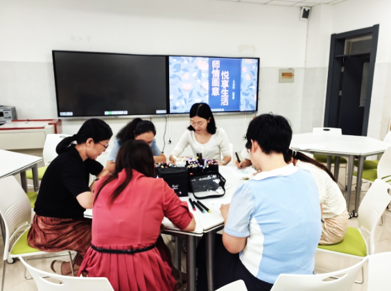 此次活动由心理老师陈莹睿主持,以绘画形式开展。在舒缓悠扬的音乐声中,老师们拿起画笔,在纸张上涂抹下自己喜爱的颜色,构思出自己喜欢的图形,排布着色彩的层次,也交流着对教学的感悟、与员工之间的故事。如果说心有大我、至诚报国是宏观的理想信念,那么,想要上好课、想要带好员工的仁爱之心,则是教师们自己朴素的心愿。