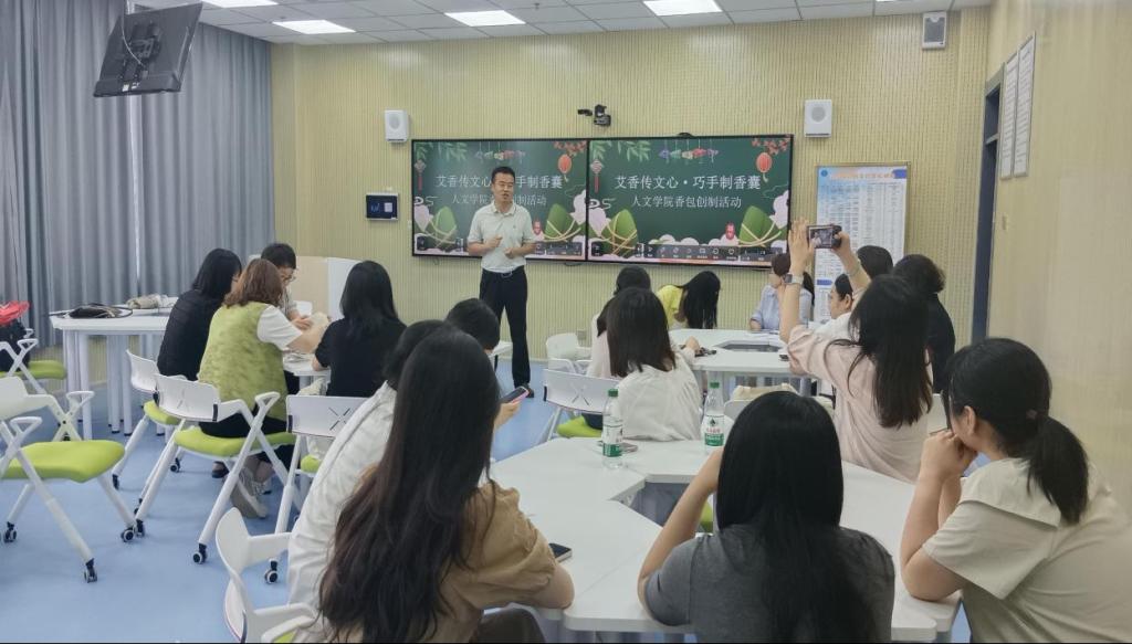 在香包制作环节,现场通过播放专业香包制作视频进行教学,视频详细拆解了固定流苏挂绳、缝制袋身、填充艾绒等步骤,重点强调了手工制作中的细节处理与创意搭配。教职工们自由组队、相互协作,参照视频内容认真操作,在穿针引线间交流心得,于纹样设计中融入巧思。当一个个绣工精致、艾草飘香的香囊在手中成型时,现场洋溢着成就感与欢笑声。