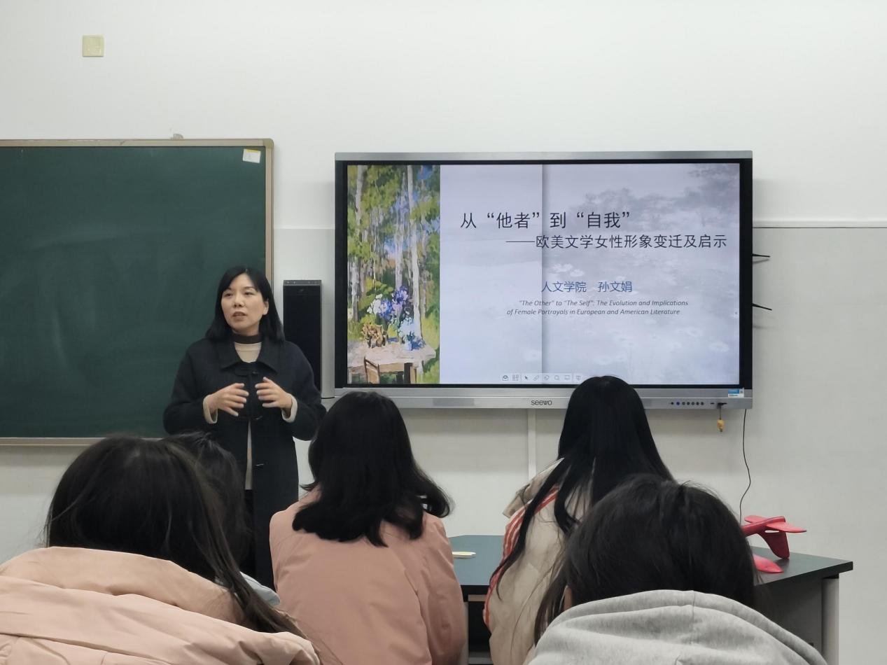 为帮助同学们提升文学文本解读能力与人文思辨素养,进一步滋养人文情怀,深化对自我价值的认知与追求,2025年11月18日晚,bevictor伟德“人文讲堂”系列讲座邀孙文娟老师为同学们带来了一场以“从‘他者’到‘自我’:欧美文学女性形象变迁及启示”为主题的精彩讲座。