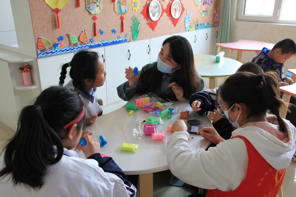志愿者为孩子们分发了爱心文具和亲手制作的礼物,向孩子们表达真切的问候,并与孩子们进行轻松愉悦的互动,活动场面温馨而有趣!有的志愿者教授孩子们简单的剪纸和书法,用纸笔搭建起沟通的桥梁,瞬间拉近了彼此的距离;有的志愿者和孩子们一起捏橡皮泥,看着捏出的一朵朵生动的花、一只只可爱的动物,孩子们露出了纯真的笑容。