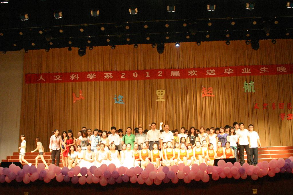 2012年6月13日晚7:00,由人文科学系主办的2012届欢送毕业生晚会在老员工活动中心演播厅拉开帷幕。员工处处长刘宝峰、校团委书记刘晓莉、人文系副主任王聿发、人文系党总支副书记张会峰以及全体人文系老师出席了本次晚会。