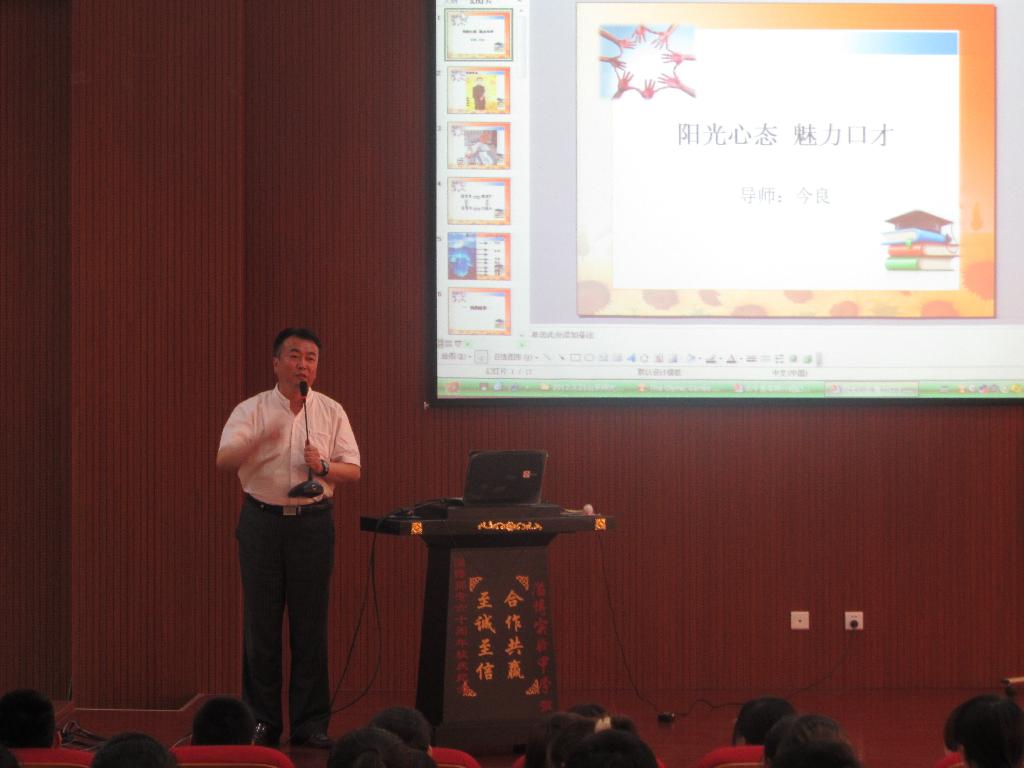 2012年5月10日下午四点, 由山东省朗诵冠军今良老师主讲,由老员工和人文科学系联合主办的以 “阳光心态 魅力口才” 为主题的讲座在奂山书院隆重举行。