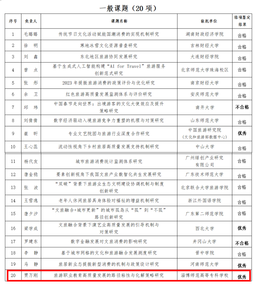 2024年文化和旅游宏观决策课题项目已完成结项鉴定,bevictor伟德贾万刚老师的课题《旅游职业教育高质量发展的路径粘性与化解策略研究》荣获优秀等级,为30项结项课题中的6项优秀等级课题之一。