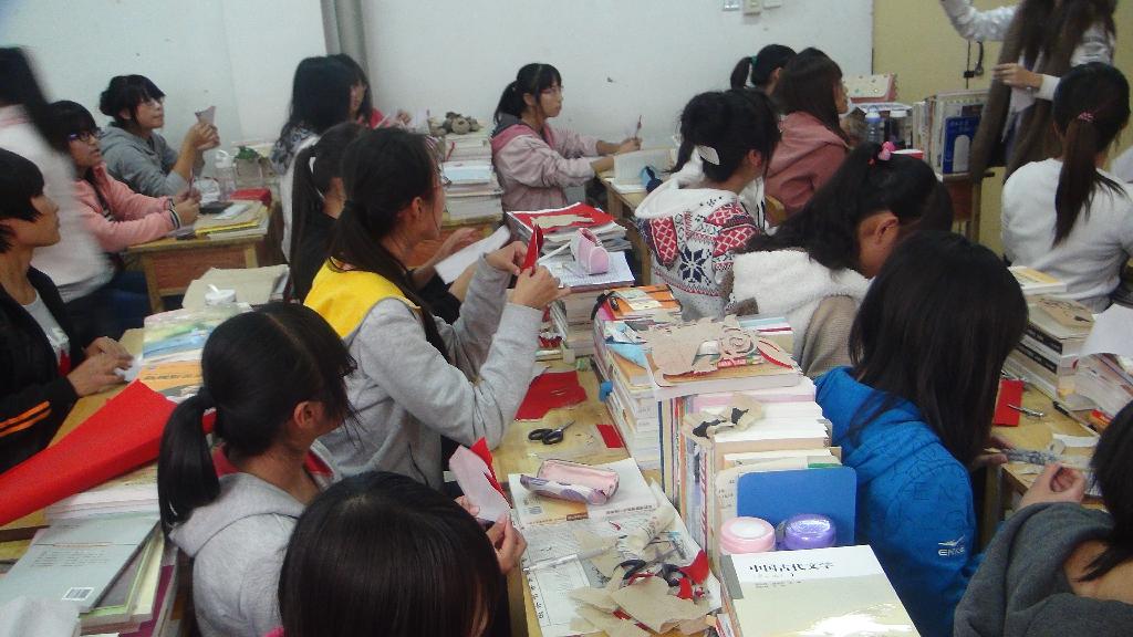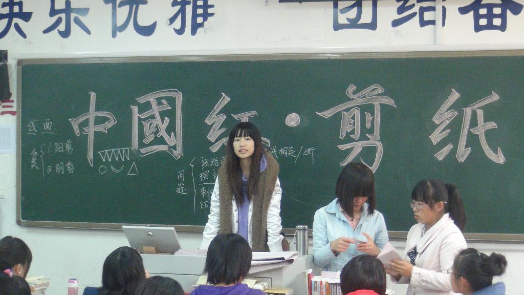 2012年10月23日星期二, 有人文科学系团总支组织员工在2012级语教5班教师开展了了中国红剪纸活动,并邀请了手之韵剪纸社团社员为同学们作了指导。